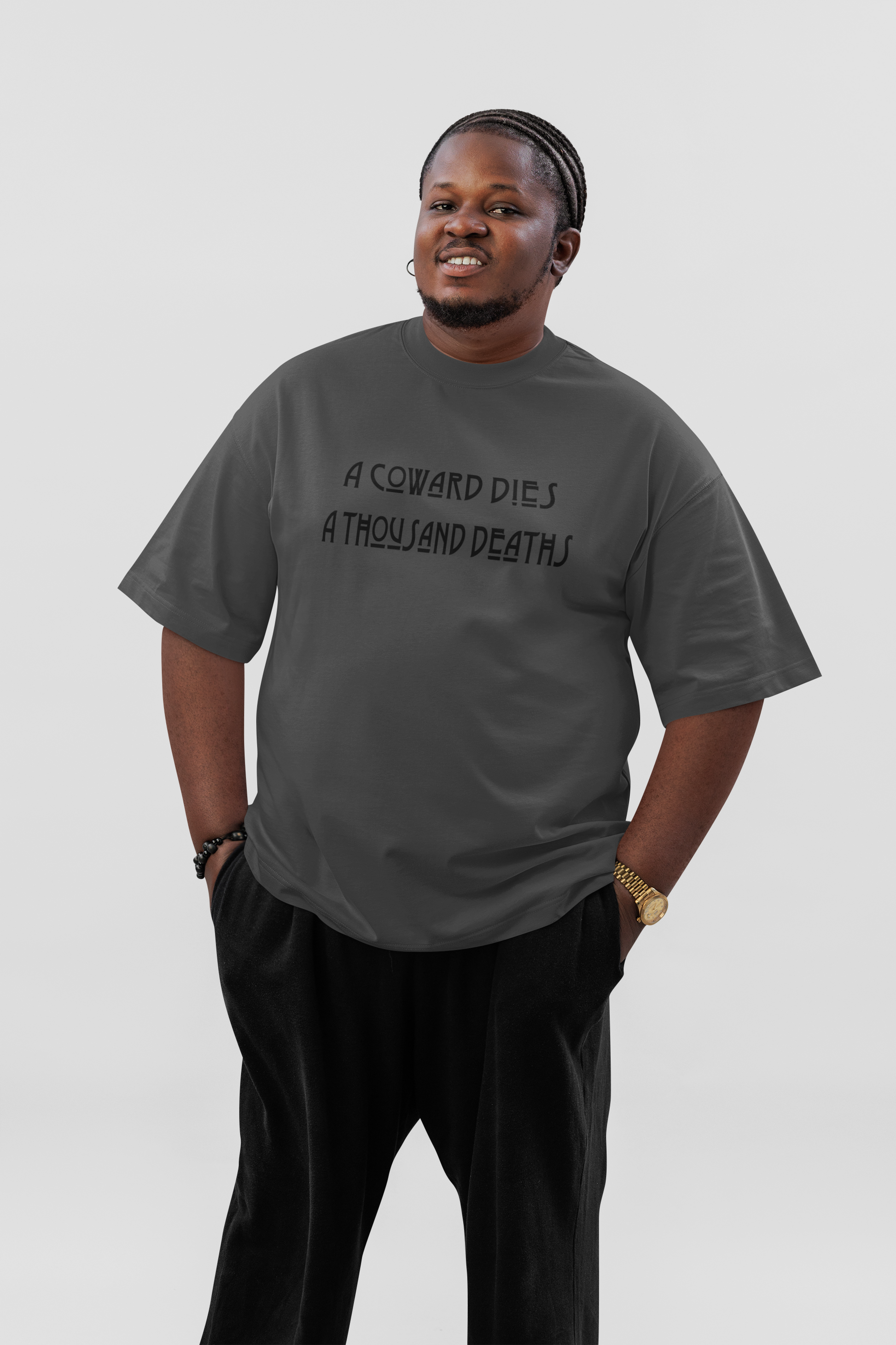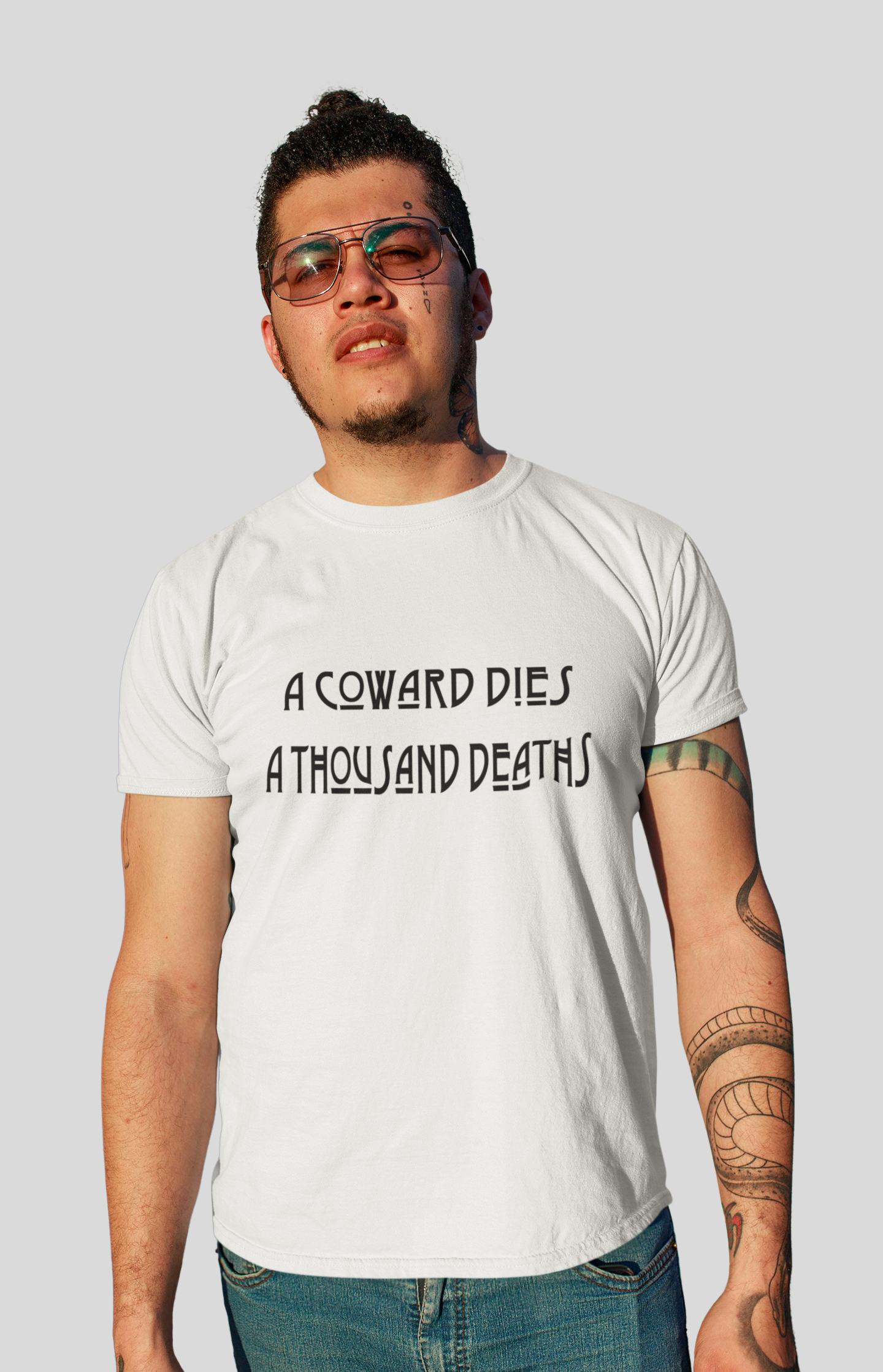 This 'A Coward Dies a Thousand Deaths' T-Shirt is a statement for those who think conviction and integrity are more important than life. It gives off a bold and confident vibe, perfect for those who want to express their strong beliefs. It is relevant for activists, advocates, and individuals with strong principles. Ideal for wearing on protests, rallies, demonstrations, or as a casual statement piece.