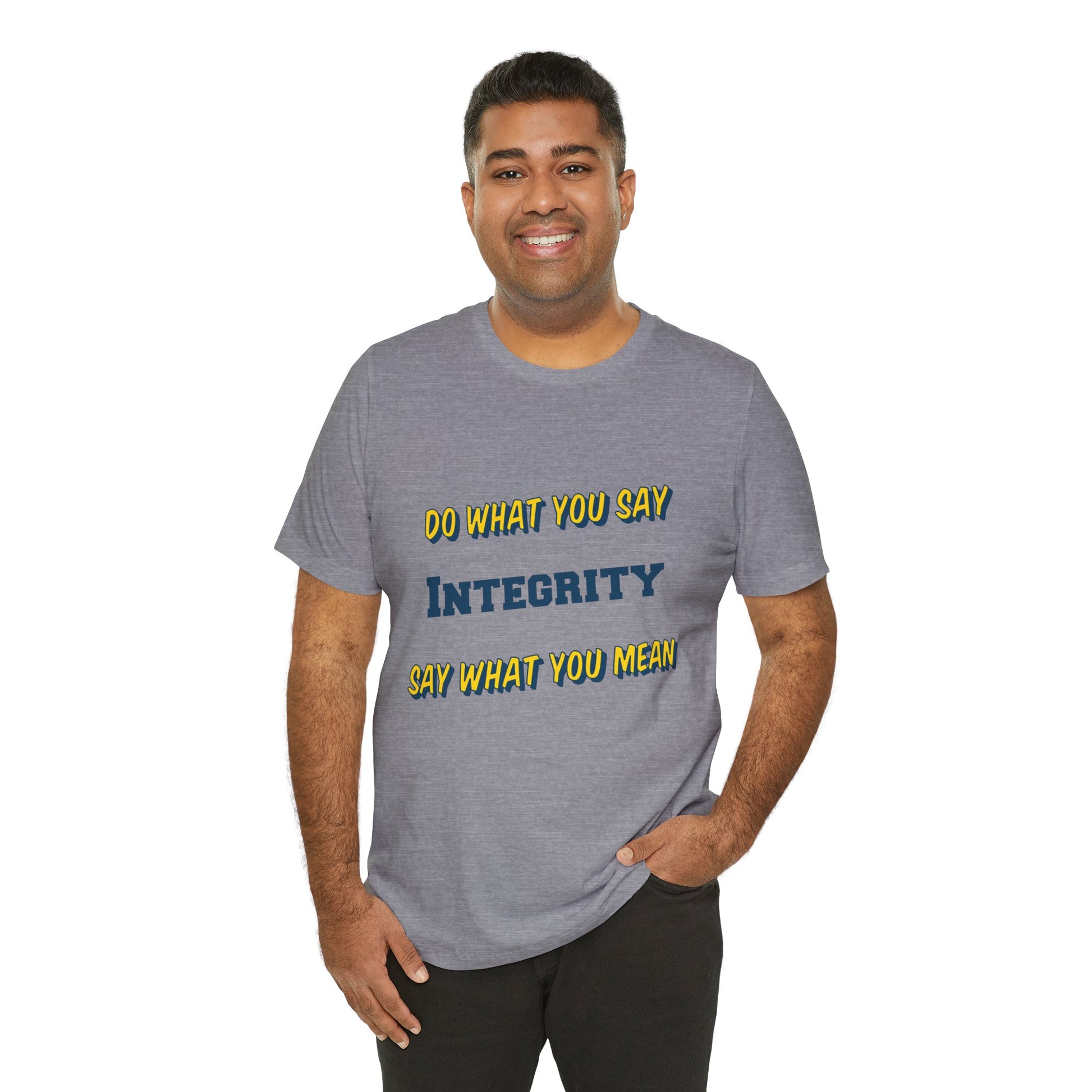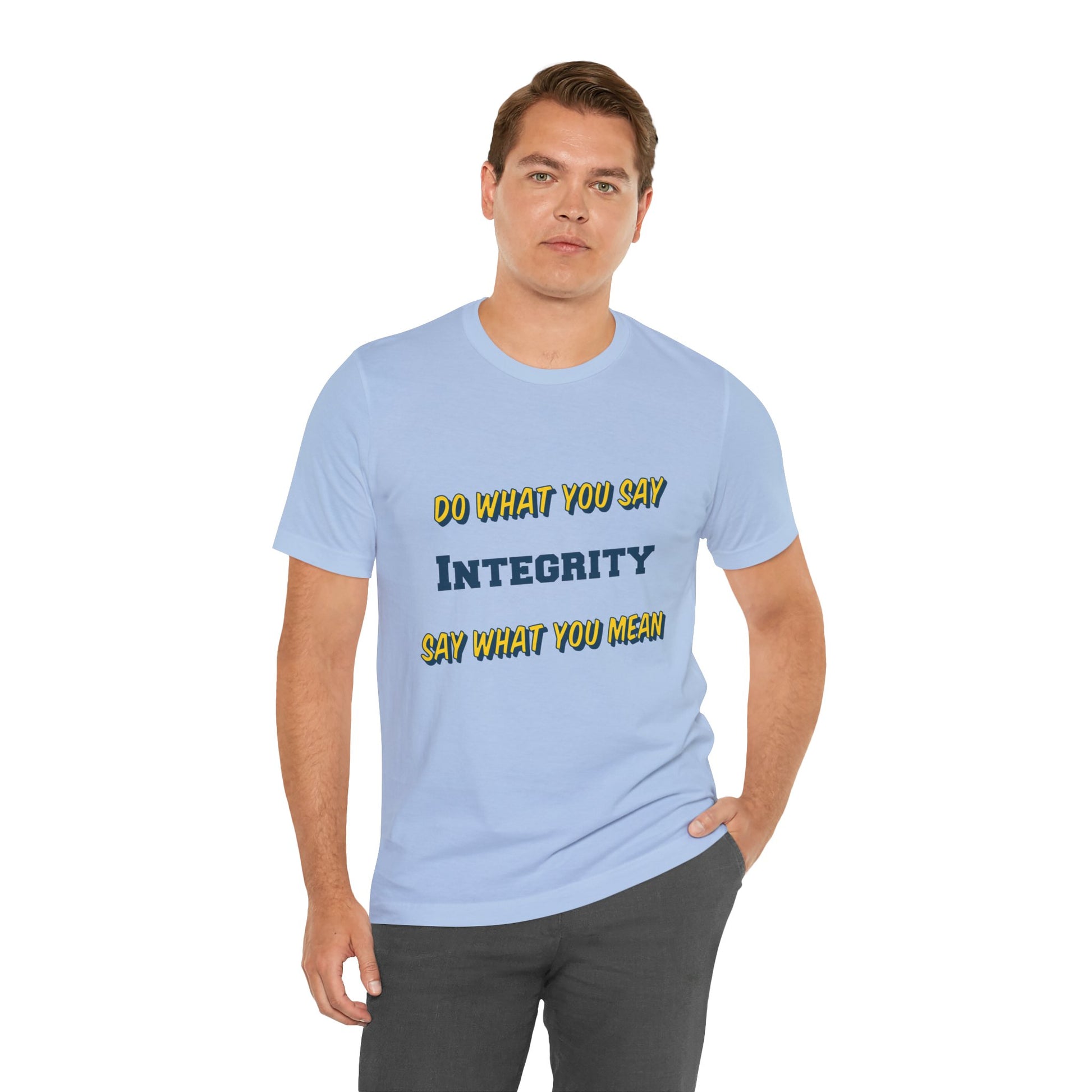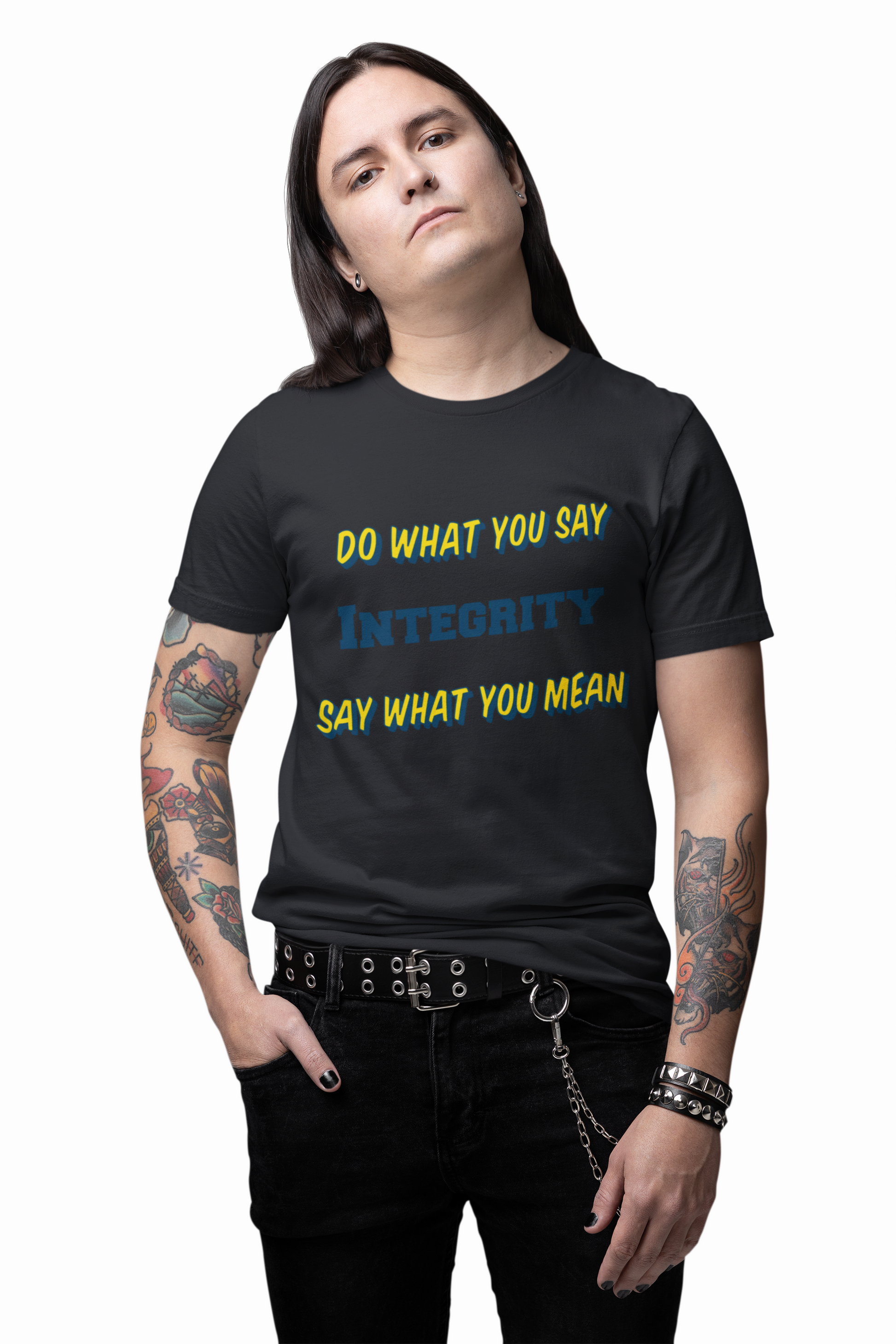 This "Do What You Say, Say What You Mean; Integrity" T-Shirt is a plea for people to have the self determination to live by principles. It gives a message of honesty and integrity, perfect for those who value these virtues in their lives. This T-Shirt is relevant for everyday wear, as well as for occasions where one wants to showcase their commitment to integrity.