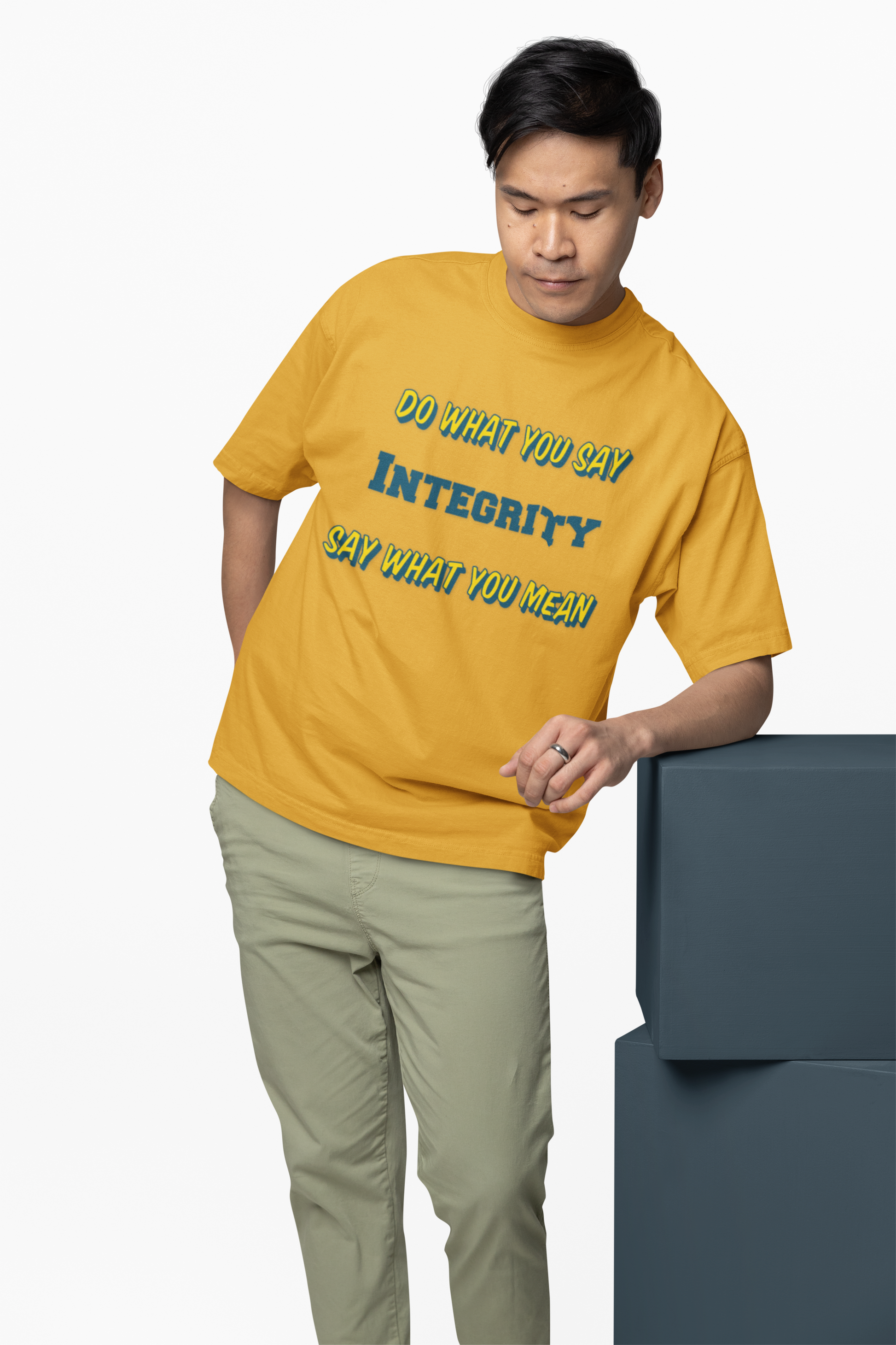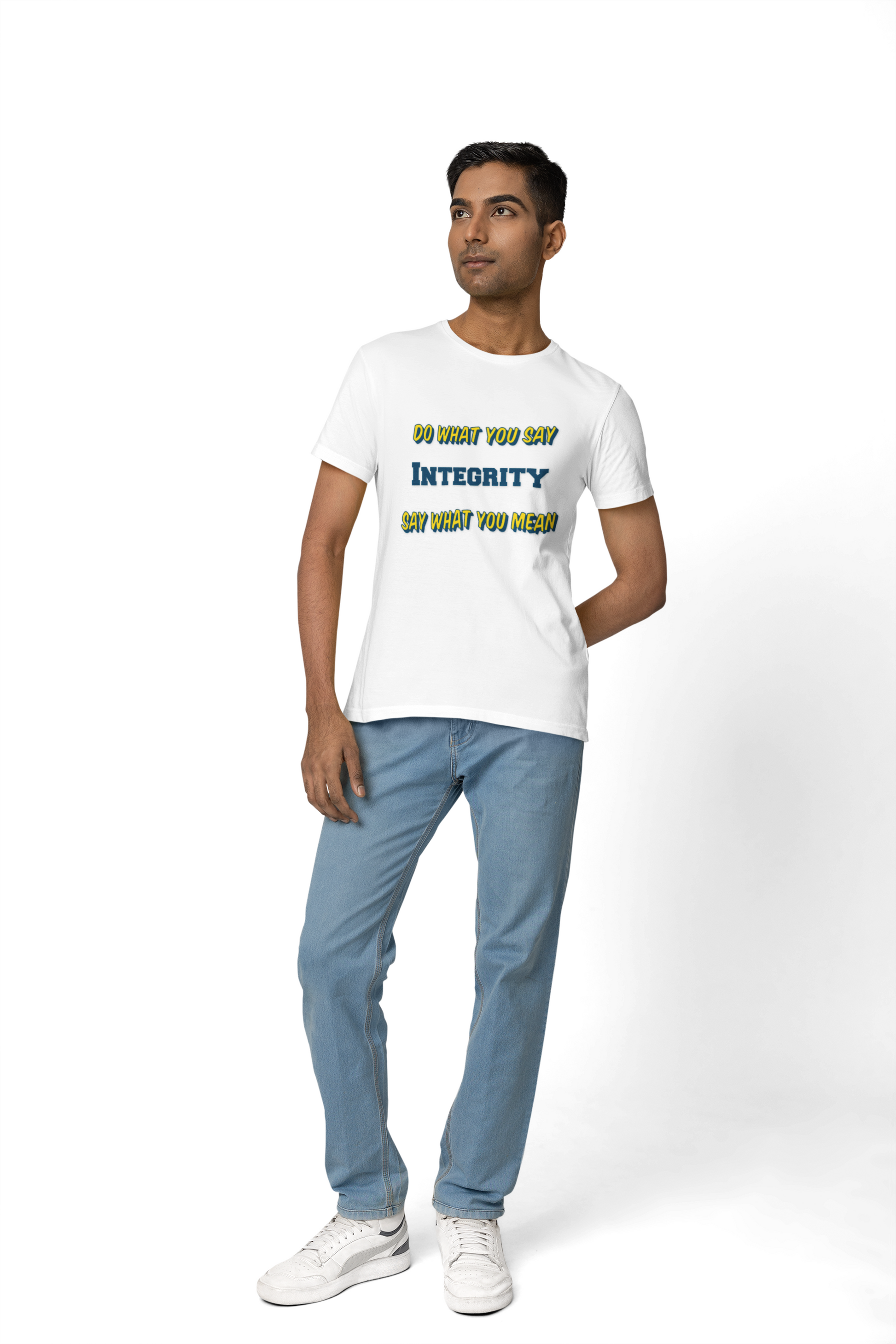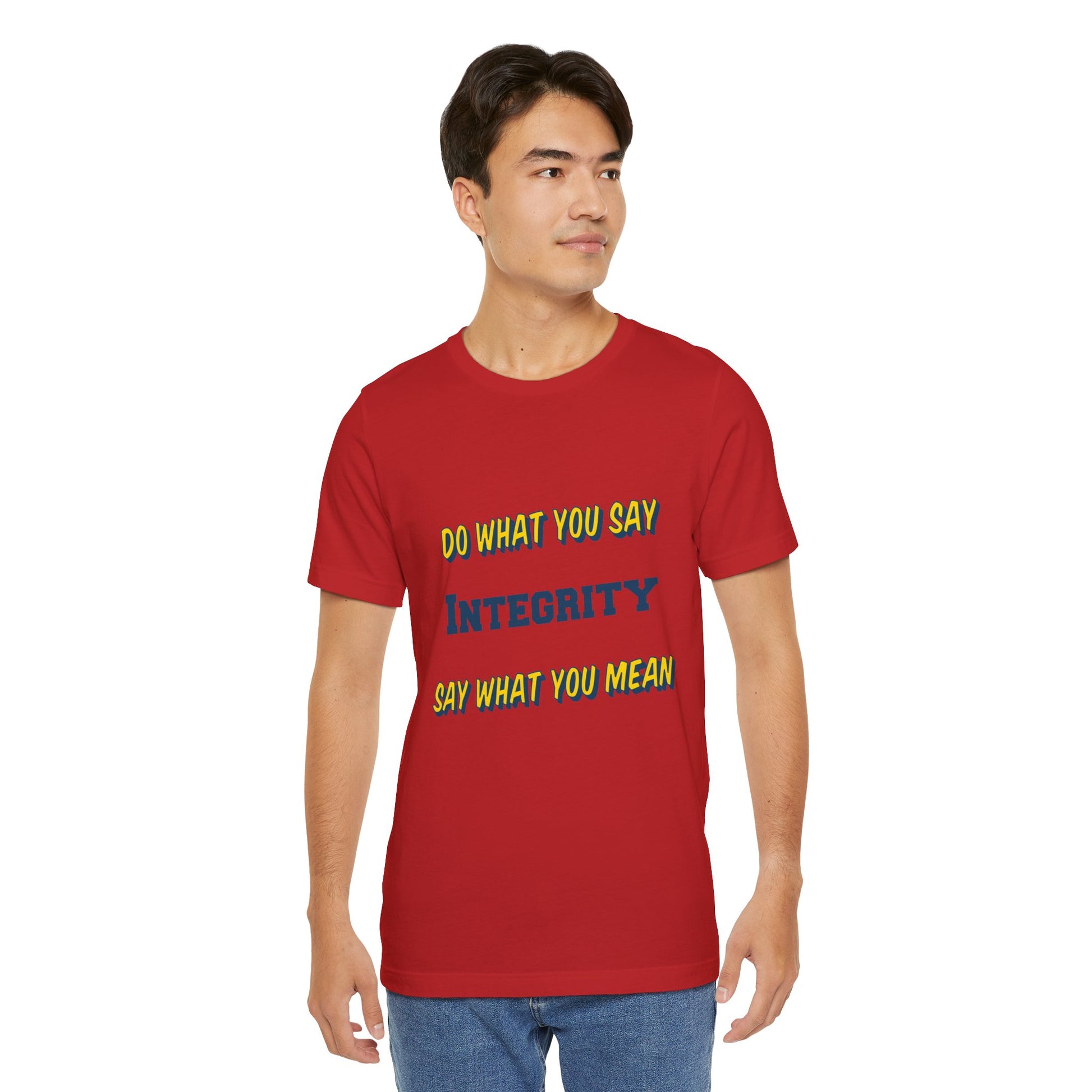 This "Do What You Say, Say What You Mean; Integrity" T-Shirt is a plea for people to have the self determination to live by principles. It gives a message of honesty and integrity, perfect for those who value these virtues in their lives. This T-Shirt is relevant for everyday wear, as well as for occasions where one wants to showcase their commitment to integrity.