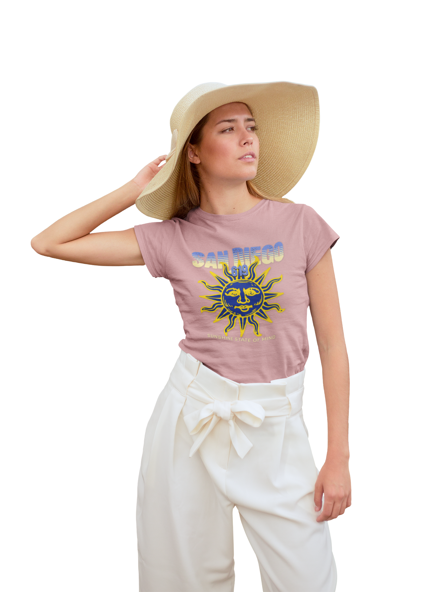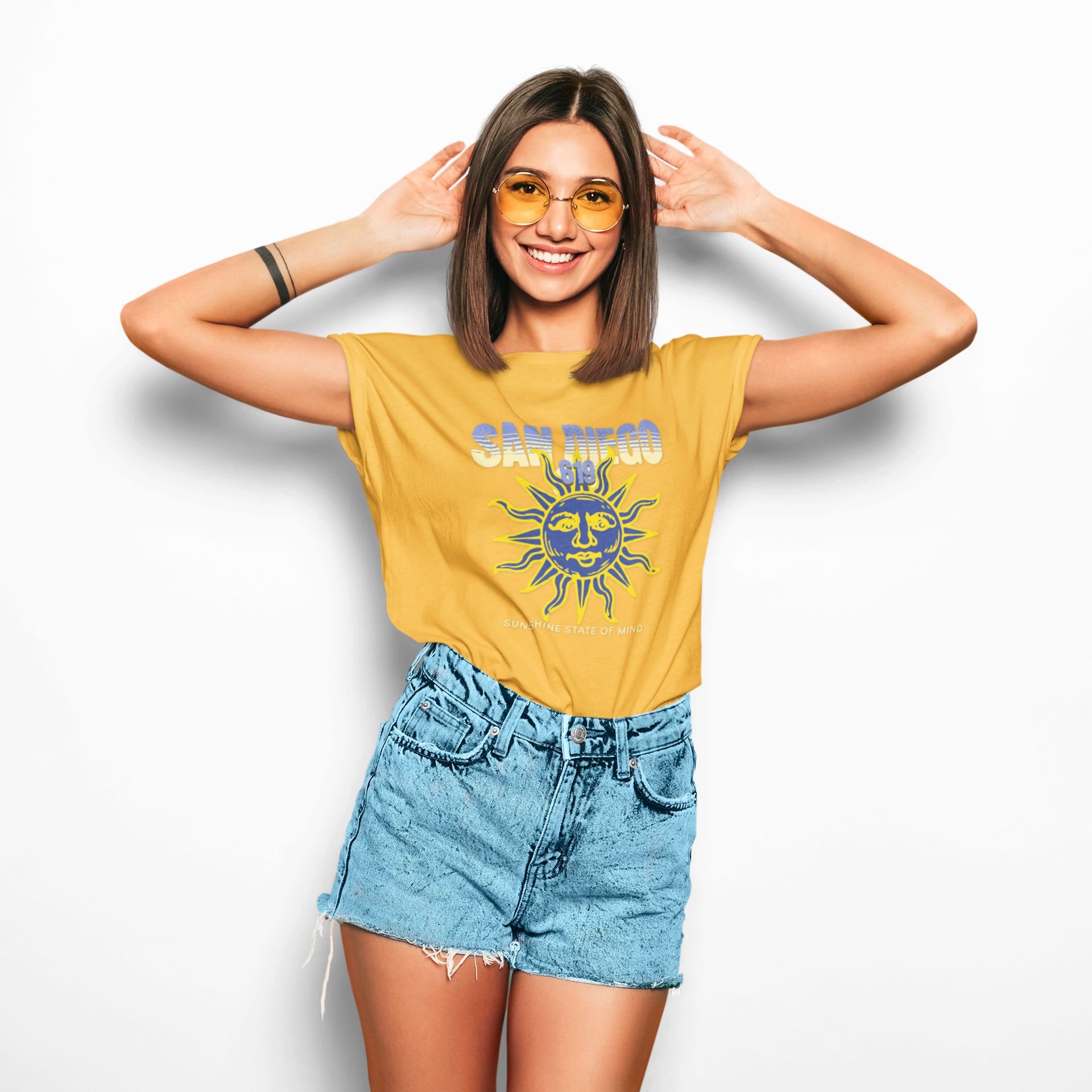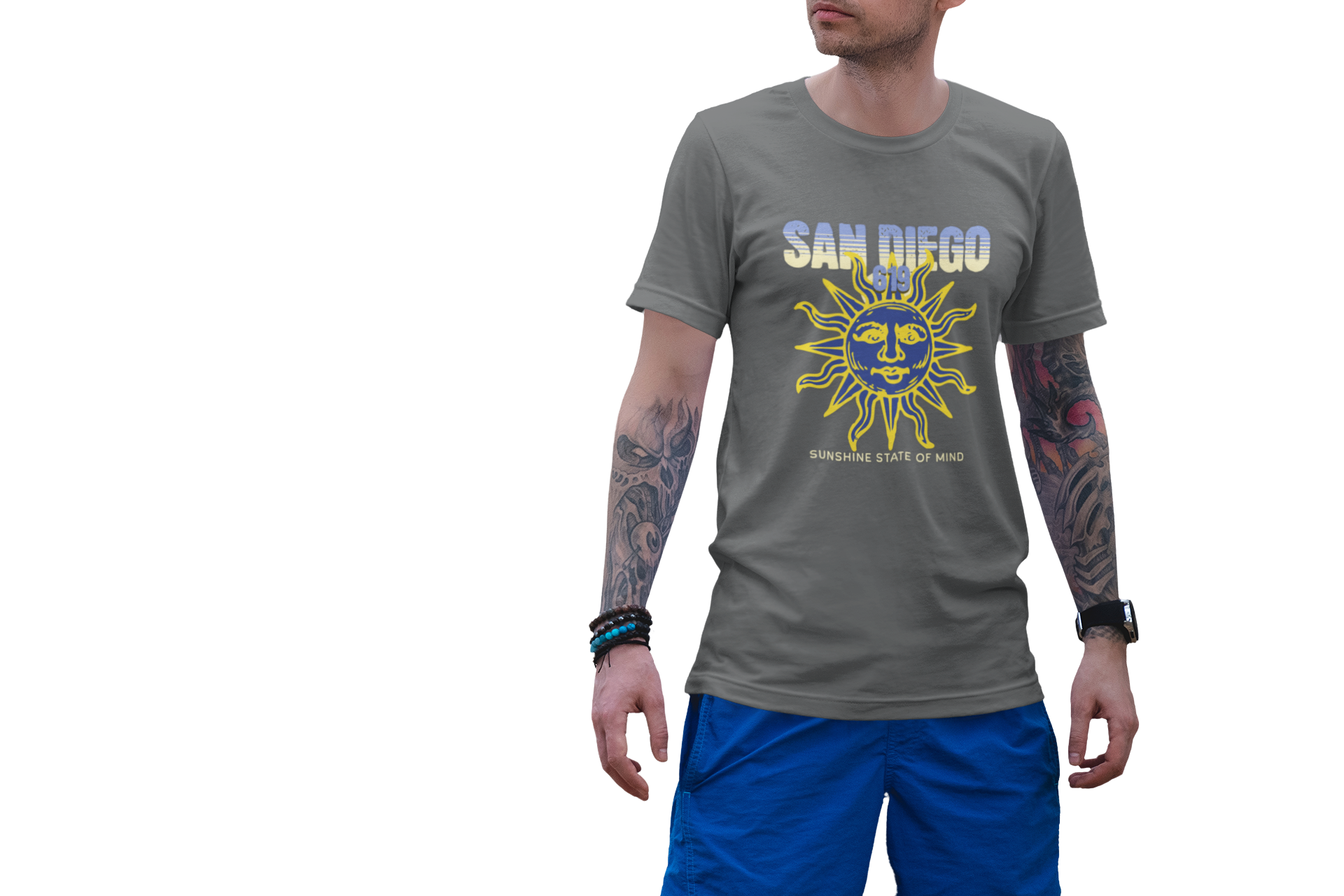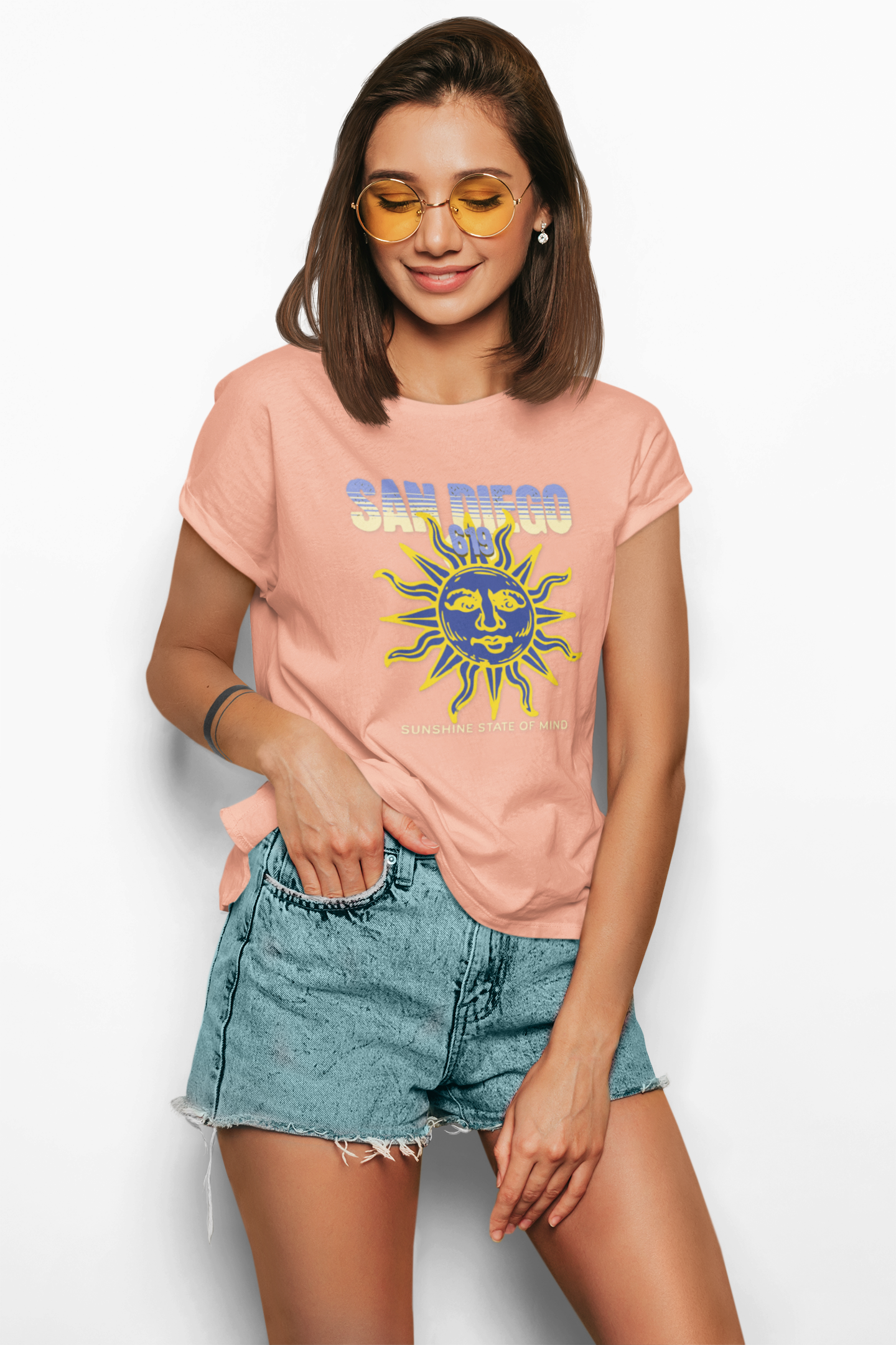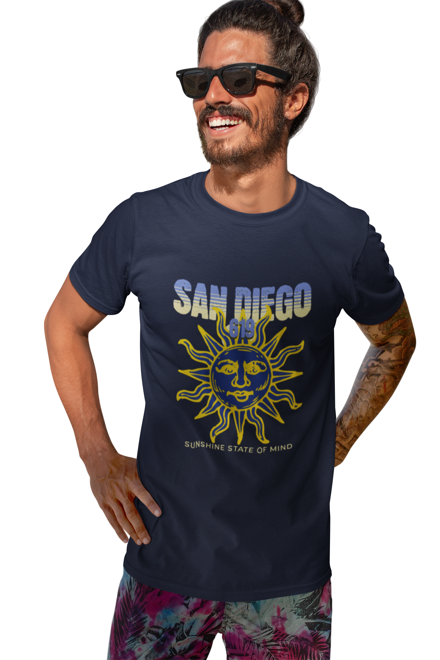 This San Diego-themed T-Shirt, featuring the phrase 'San Diego, 619, Sunshine State of Mind', is perfect for anyone who loves the sunny weather of San Diego. It exudes a fun and laid-back vibe, making it a great addition to a casual wardrobe. Ideal for residents of San Diego or visitors wanting a piece of the city to take home. Perfect for summer, beach days, and casual outings.