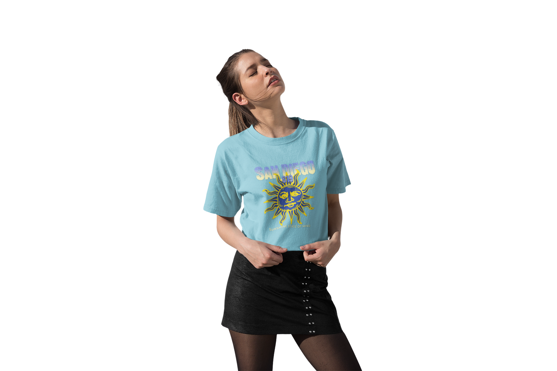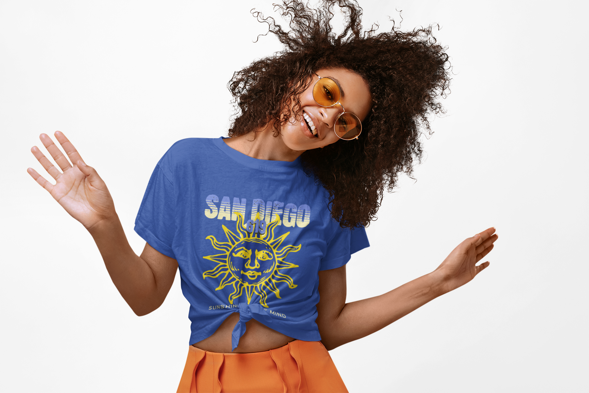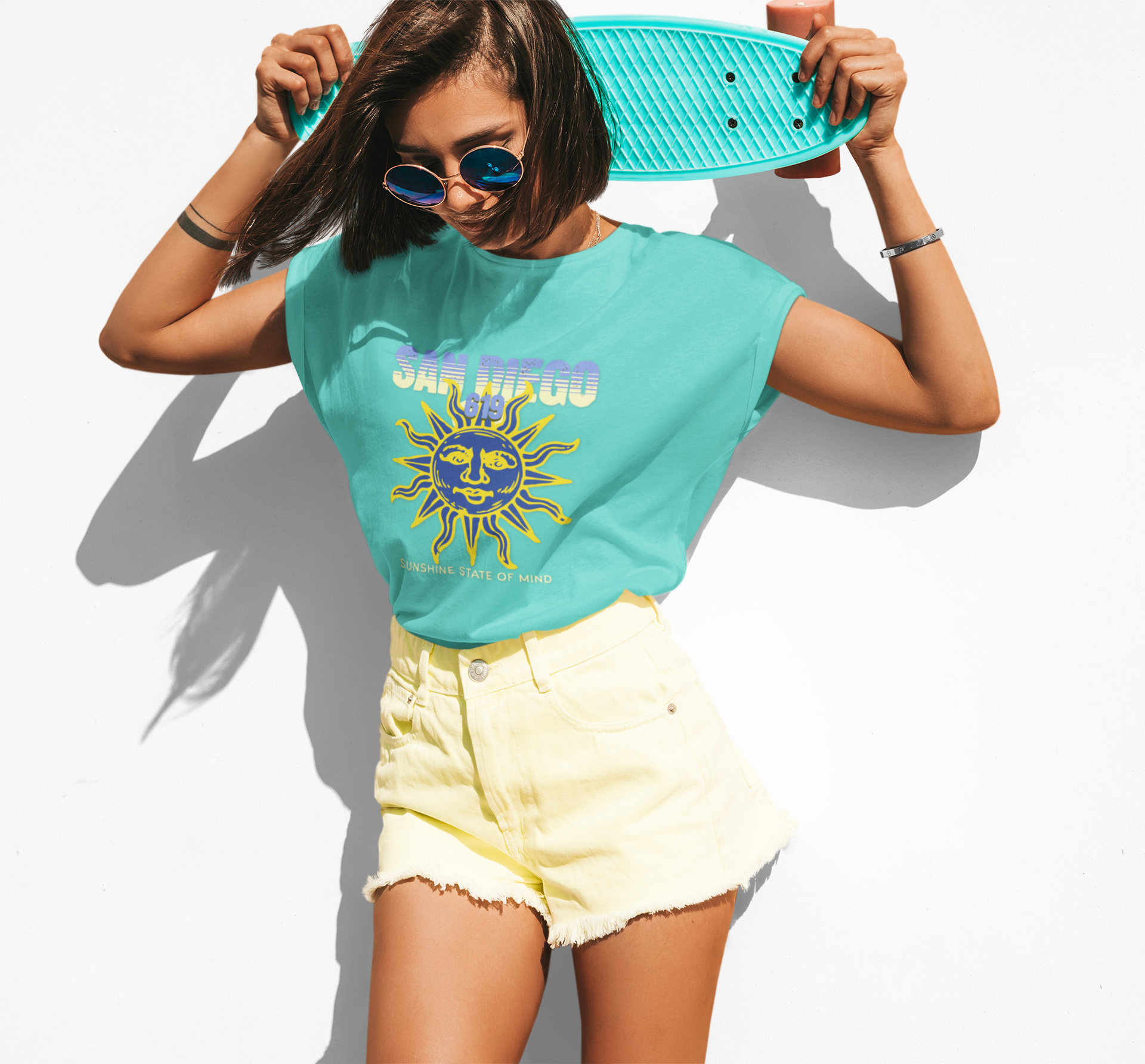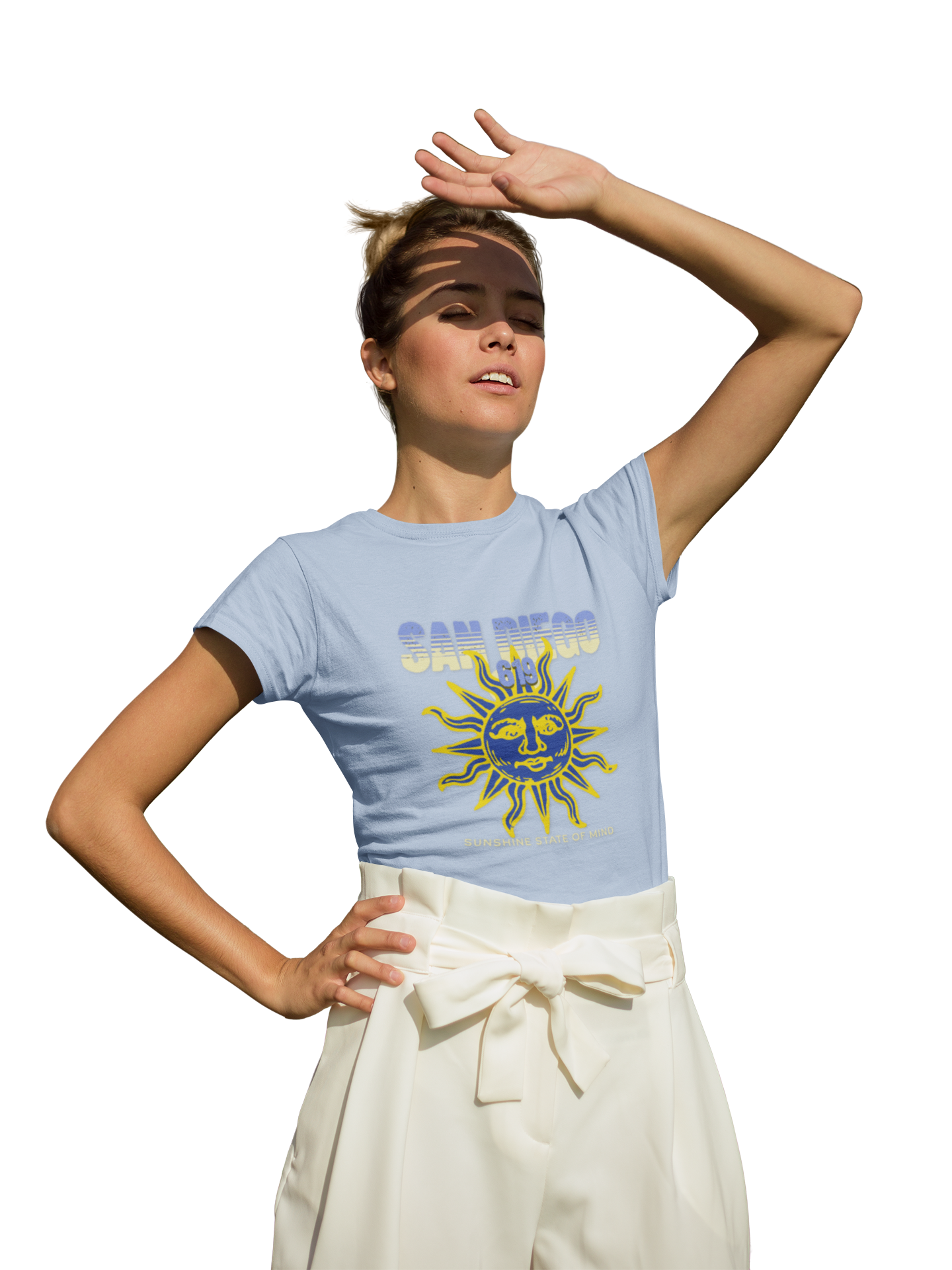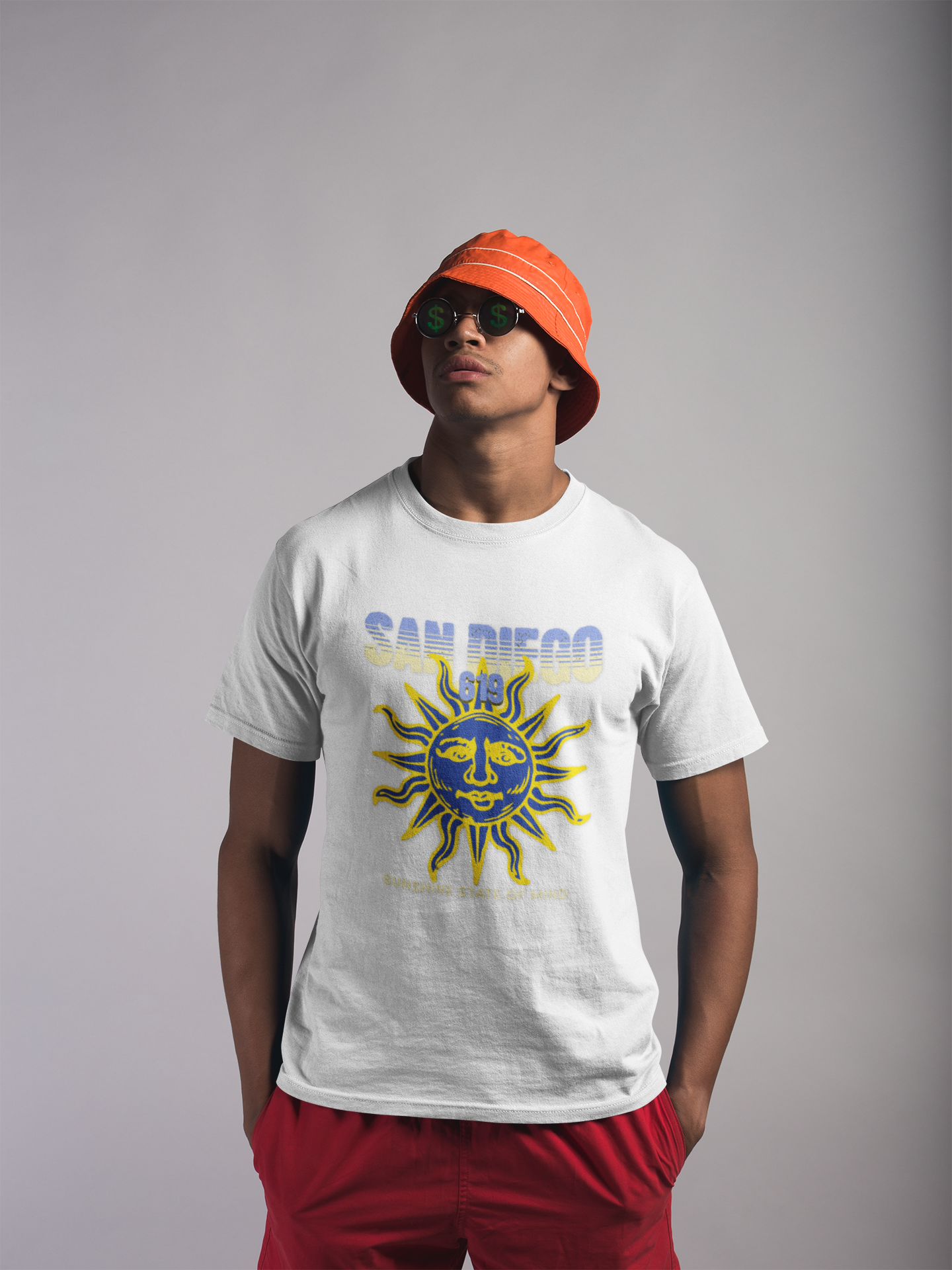 This San Diego-themed T-Shirt, featuring the phrase 'San Diego, 619, Sunshine State of Mind', is perfect for anyone who loves the sunny weather of San Diego. It exudes a fun and laid-back vibe, making it a great addition to a casual wardrobe. Ideal for residents of San Diego or visitors wanting a piece of the city to take home. Perfect for summer, beach days, and casual outings.